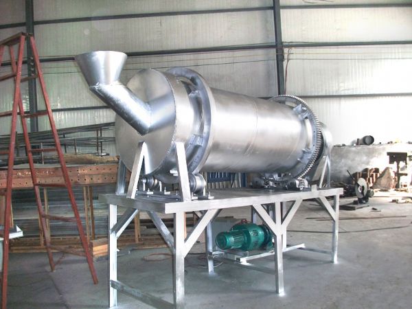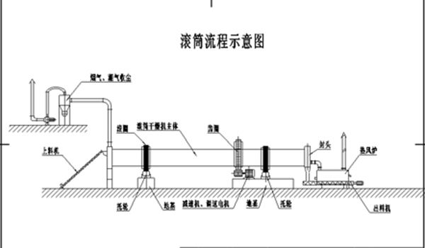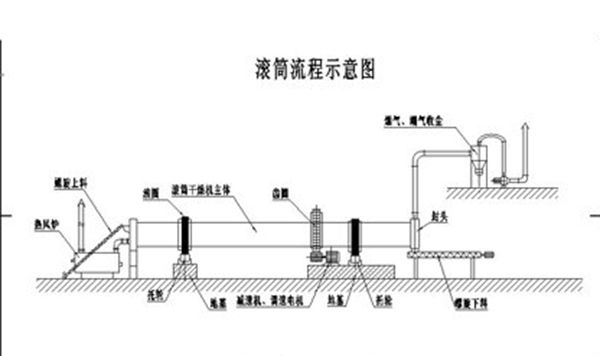 是將待干燥的濕物料由皮帶輸送機或斗式提升機送到料斗,然后經料斗的加料機通過加料管道進入加料端。加料管道的斜度要大于物料的自然傾角,以便物料順利流入干燥器內。干燥器圓筒是一個與水平線略成傾斜的旋轉圓筒。物料從較高一端加入,載熱體由低端進入,與物料成逆流接觸,也有載熱體和物料一起并流進入筒體的。隨著圓筒的轉動物料受重力作用運行到較底的一端。濕物料在筒體內向前移動過程中,直接或間接得到了載熱體的給熱,使濕物料得以干燥,然后在出料端經皮帶機或螺旋輸送機送出。在筒體內壁上裝有抄板,它的作用是把物料抄起來又撒下,使物料與氣流的接觸表面增大,以提高干燥速率并促進物料前進。載熱體一般分為熱空氣、煙道氣等。載熱體經干燥器以后,一般需要旋風除塵器將氣體內所帶物料捕集下來。如需進一步減少尾氣含塵量,還應經過袋式除塵器或濕法除塵器后再排放。